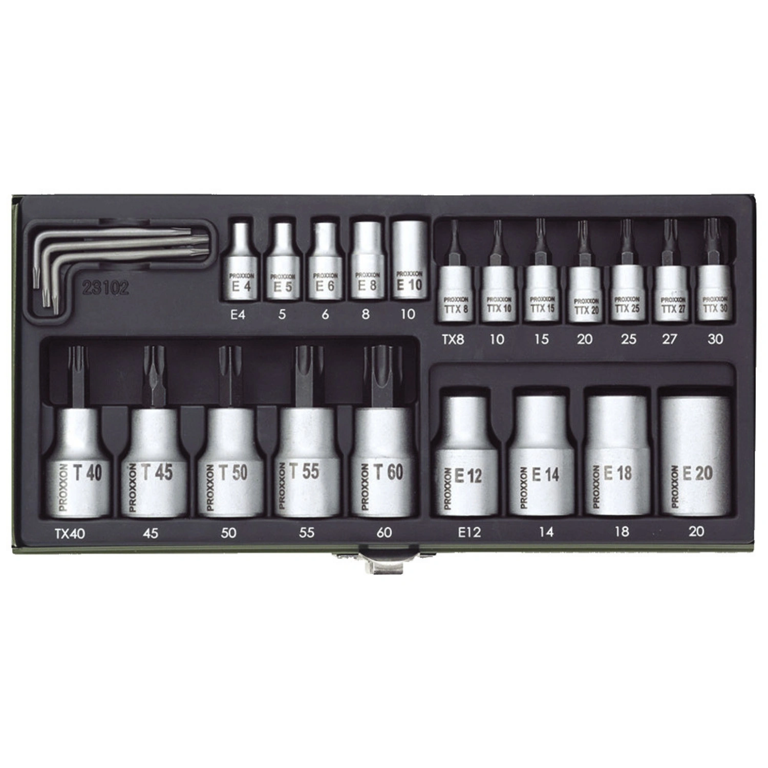 - Lieferumfang: Ratschen-Schraubendreher, 23 Sechskant-Bits 25 mm, 16 Bits extralang 80 mm, Adapter Außenvier-/Sechskant, Adapter Innenvier-/sechskant, Spezialeinsatz f. Schraubhaken, 10 Steckschlüsseleinsätze, Magnethalter f. Bohrmaschine/Elektroschrauber