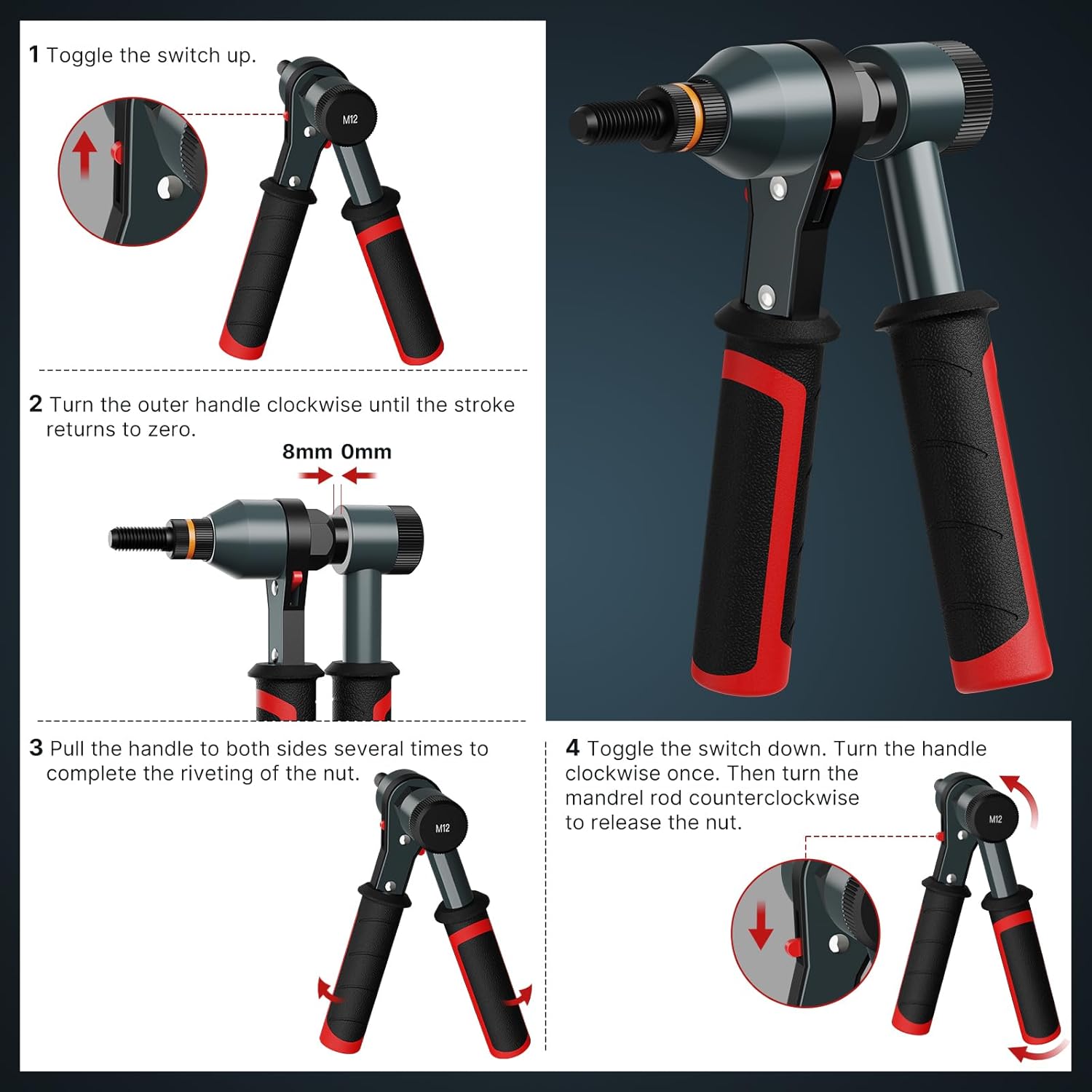 - 【Ratschenmechanismus】Das Ratschenmutter-Werkzeug verfügt über einen Ratschenmechanismus, der eine einfache und effiziente Installation von Nietmuttern ermöglicht. Dieser Mechanismus sorgt dafür, dass die Mutter ohne übermäßige manuelle Kraft sicher befestigt ist.